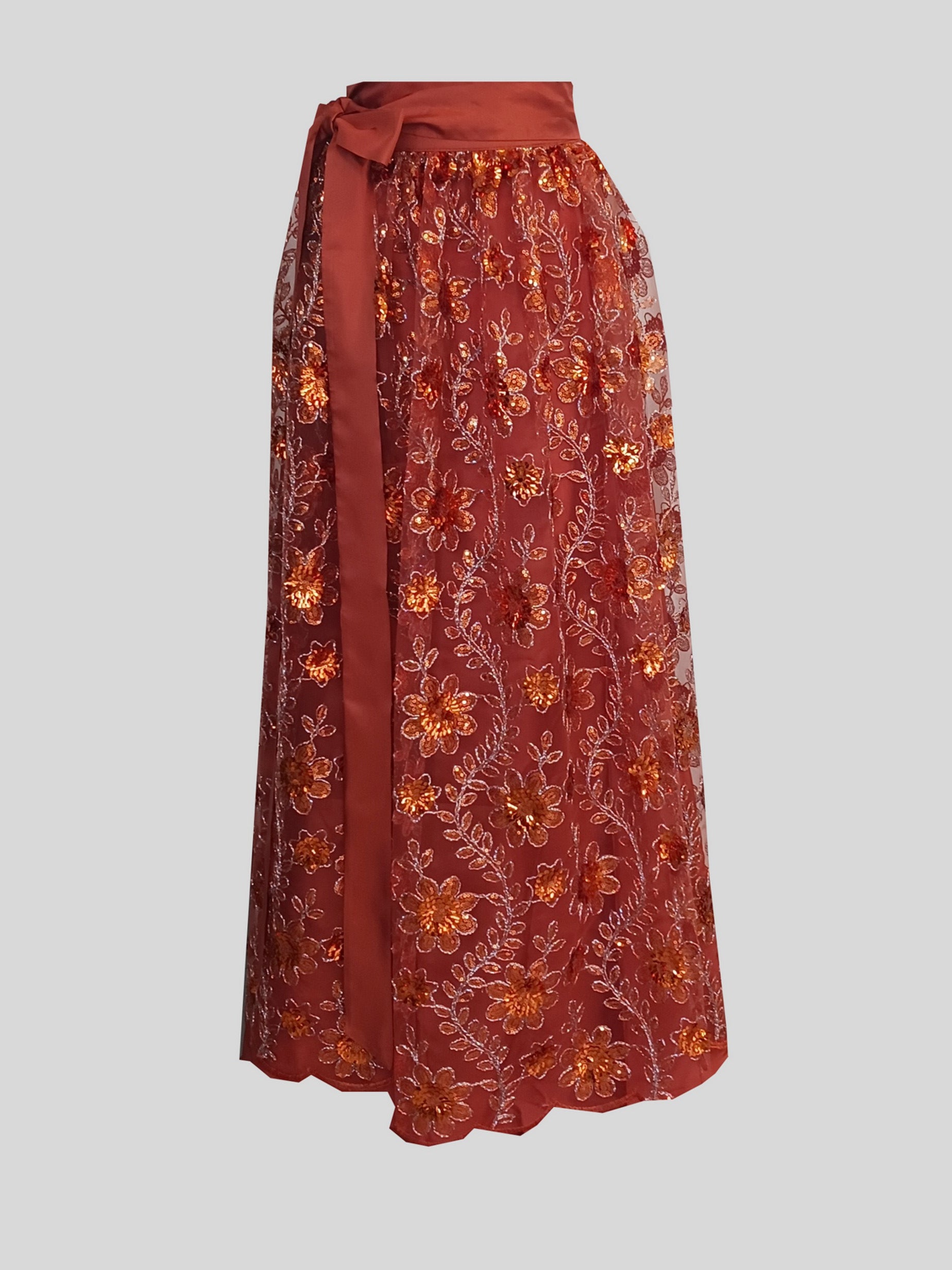 Die Spitze besteht aus leuchtendem rostfarbenem Blütenmuster und ist mit Pailletten verziert.