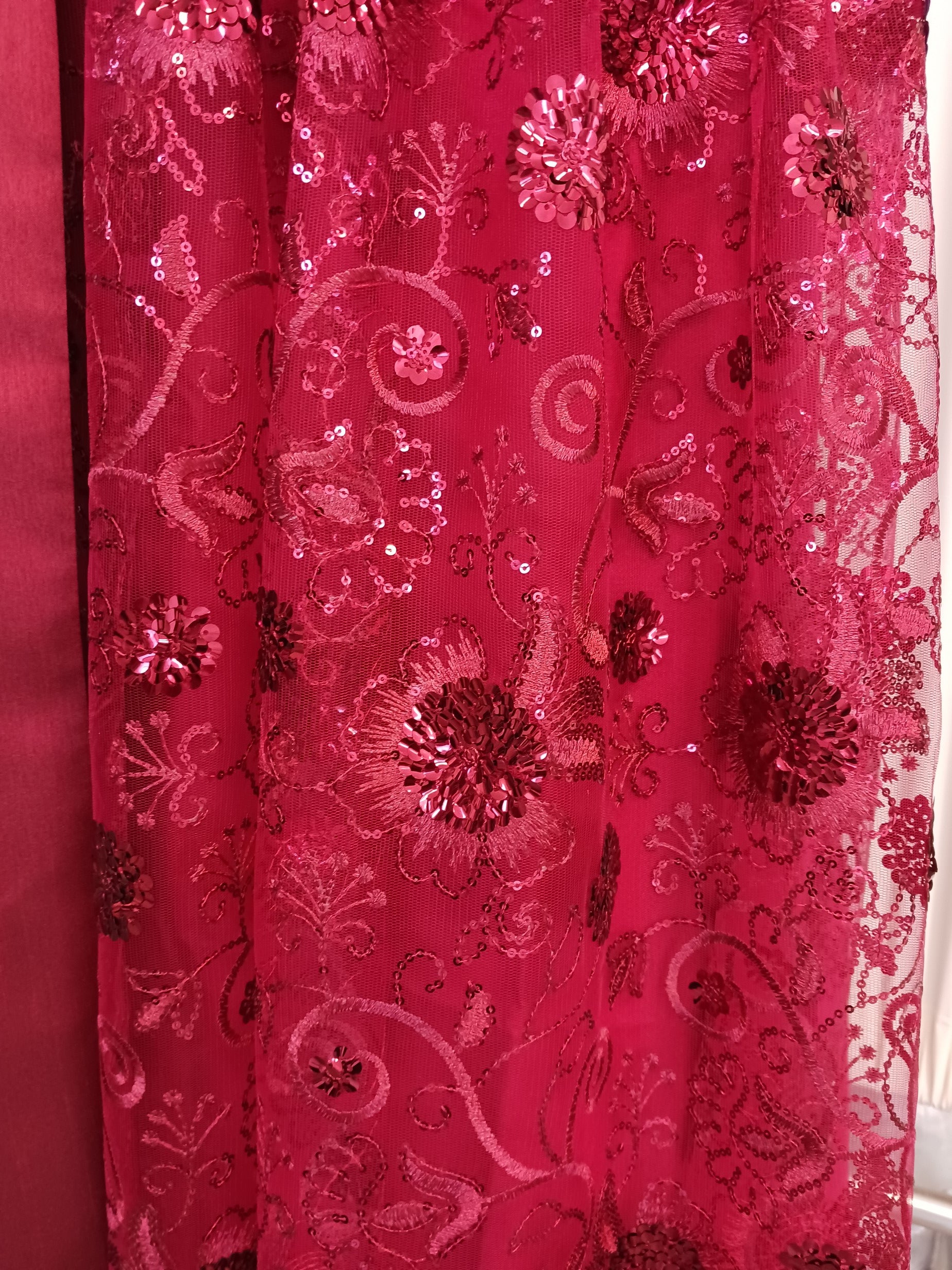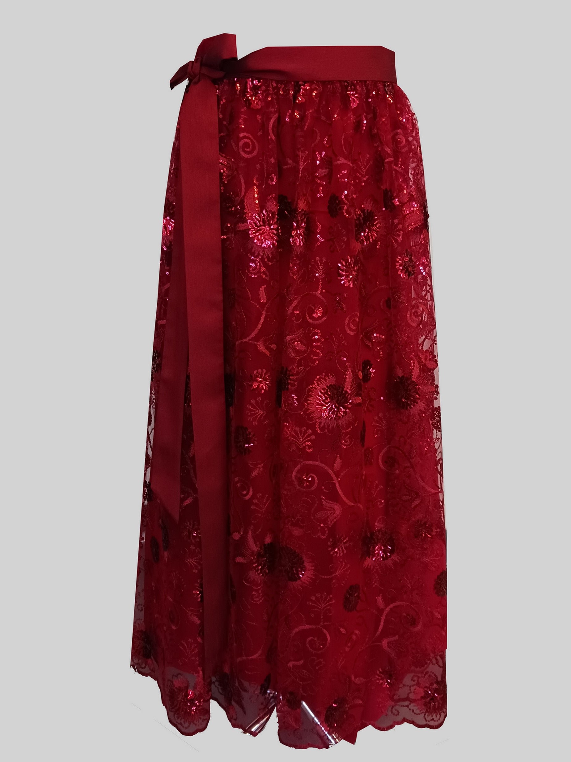 Damen Dirndlschürze franz. Spitze Blütenpailletten weinrot