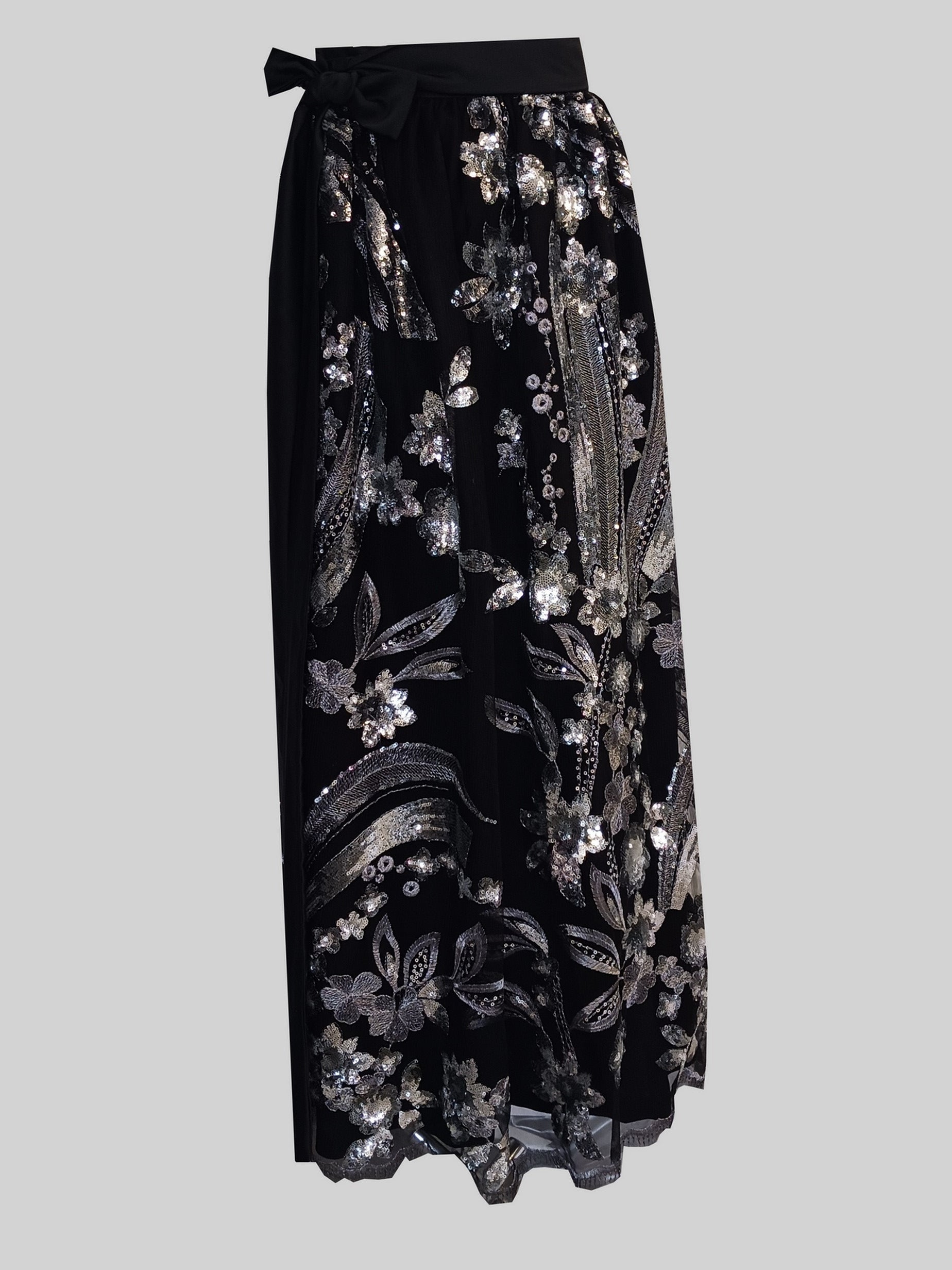 Traumhafte, edle Dirndlschürze aus Spitzen-Mesh mit wunderschönen silbrigen Blüten, einfach oder unterfüttert. Bund und Bindebänder sind aus schwarzem Satin, einfarbig.