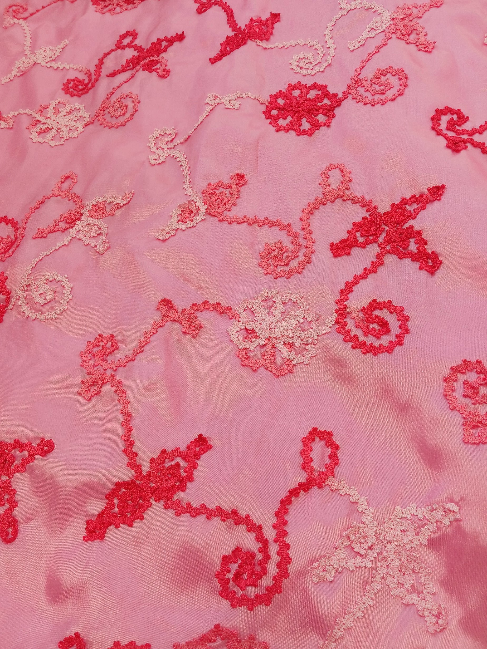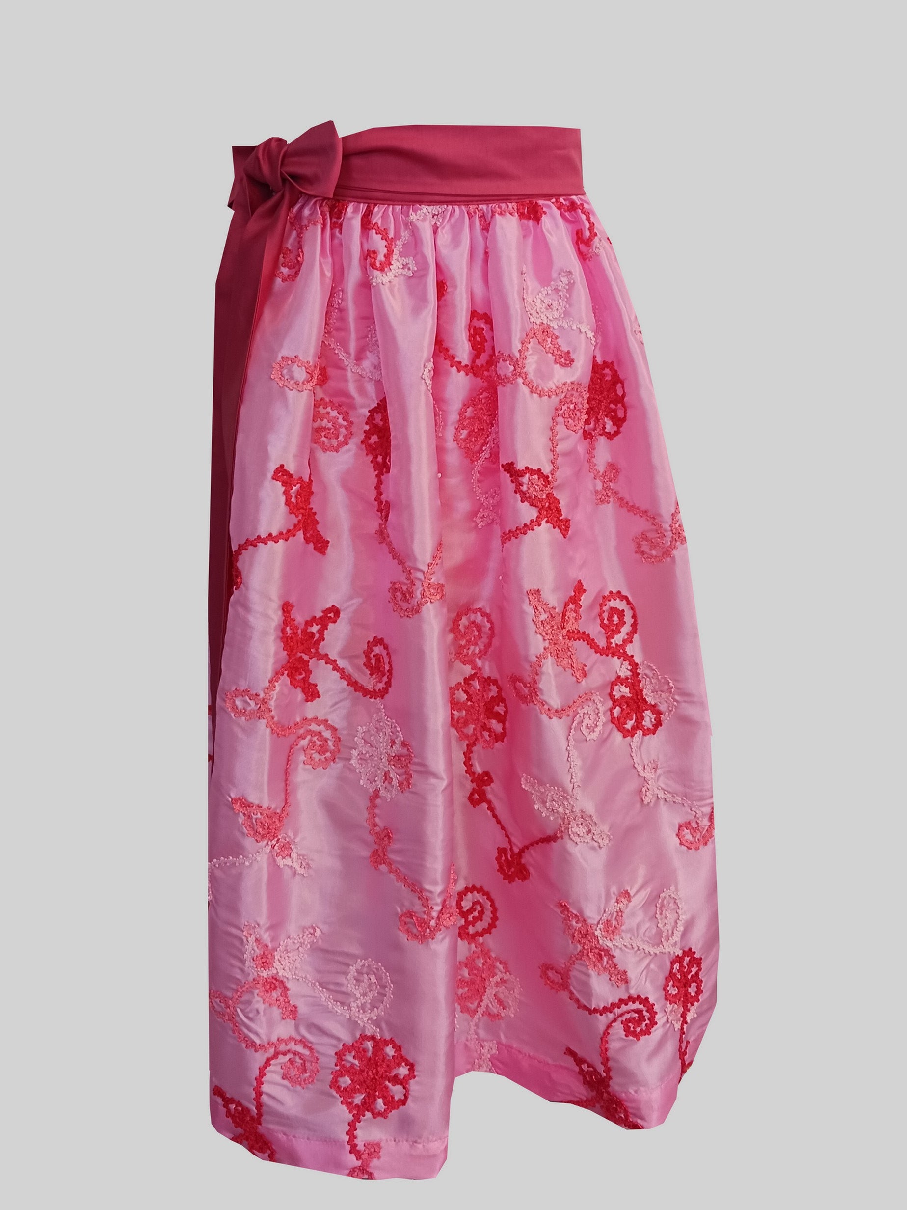 Festliche Dirndlschürze für Damen aus weichem rosa Taft mit Bändchen verziert.
