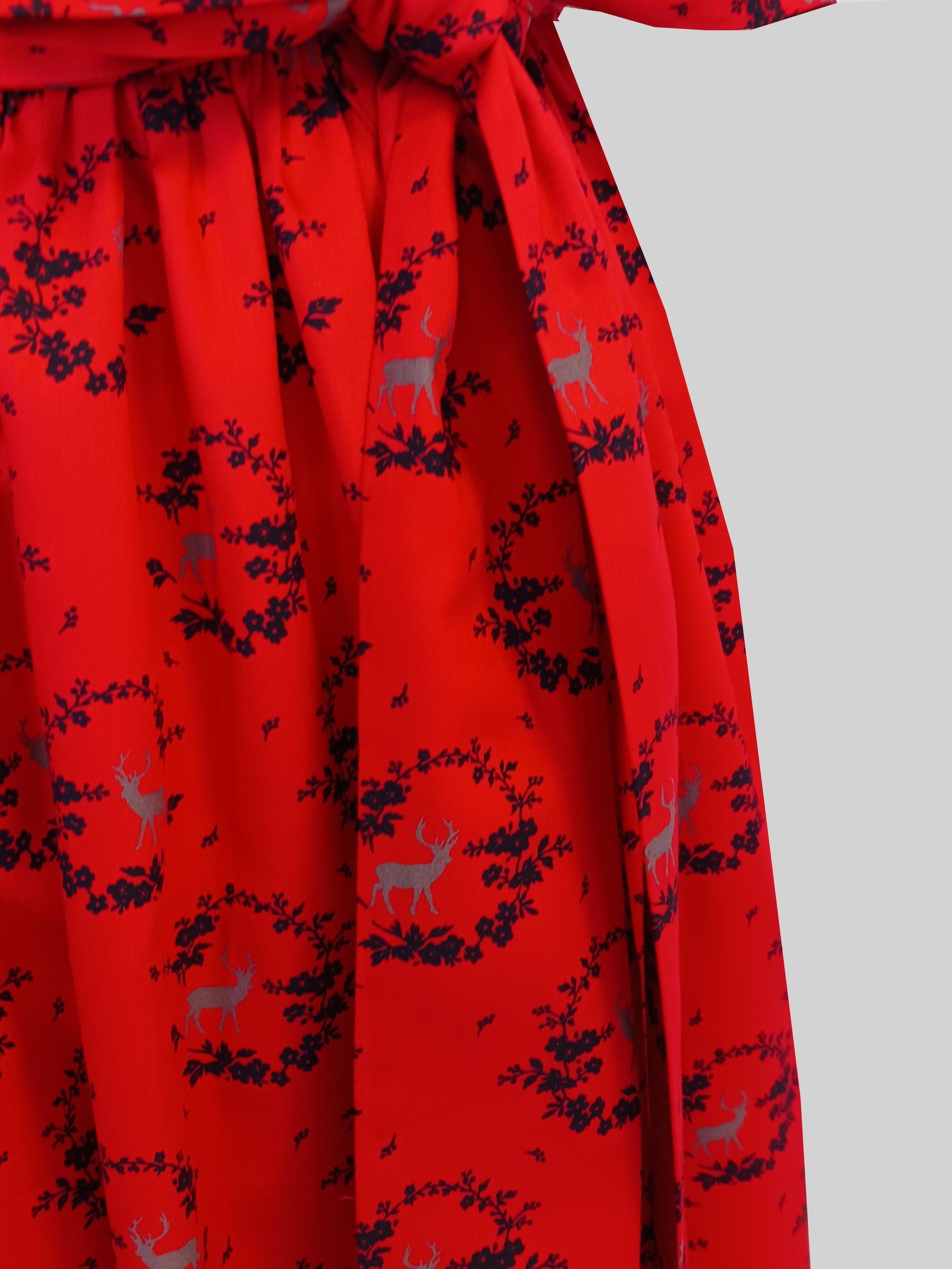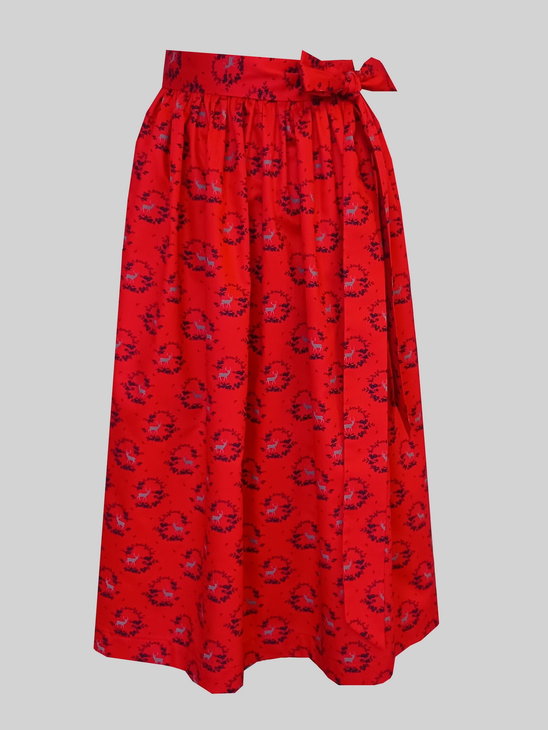 Schürze aus Baumwolle, leicht satiniert, rot mit Hirschmotiv und Ranken.