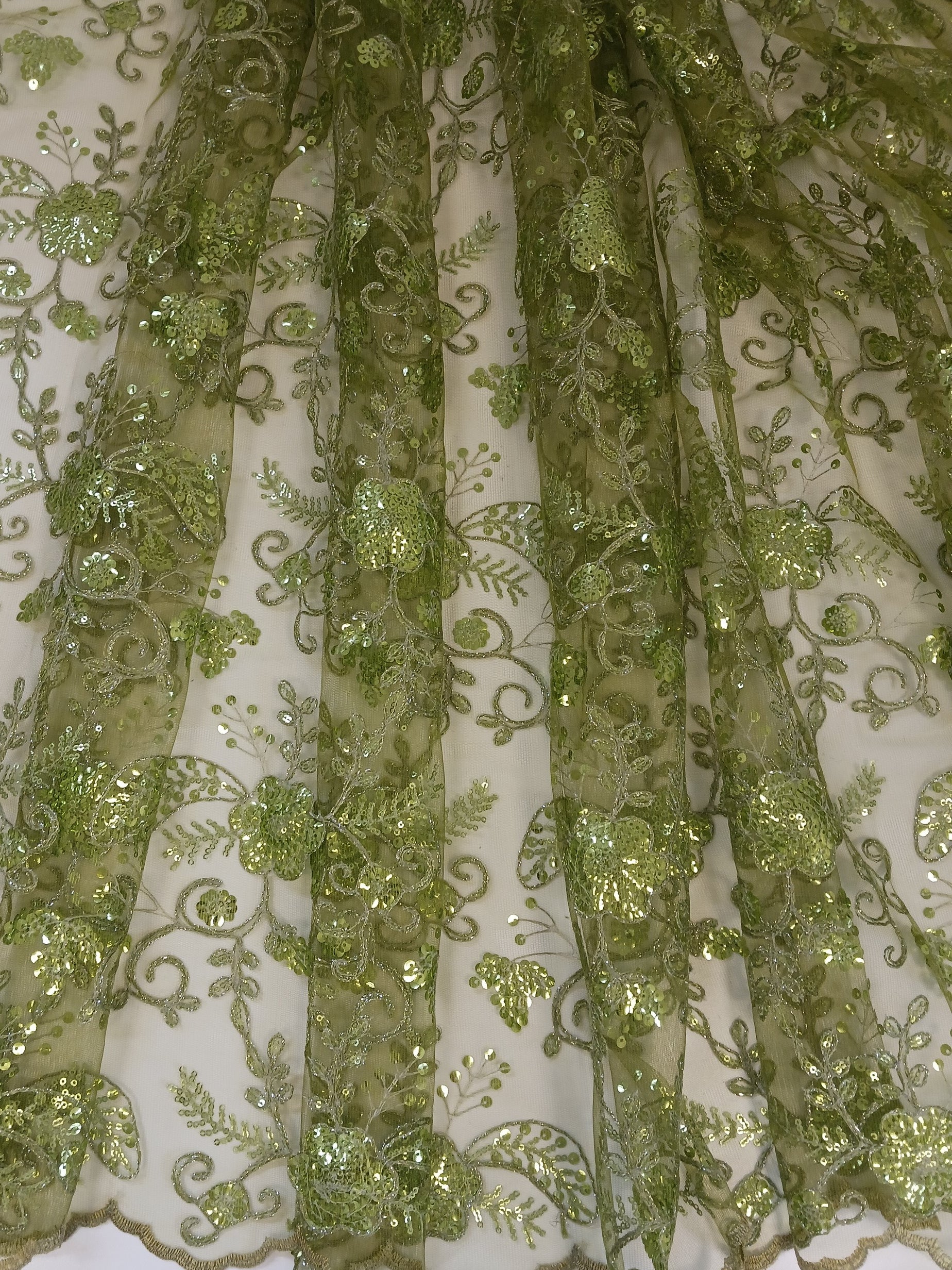 Damen Dirndlschürze franz. Spitze mit Blütenpailletten oliv 1-lagig M/60 - Sofortkauf!