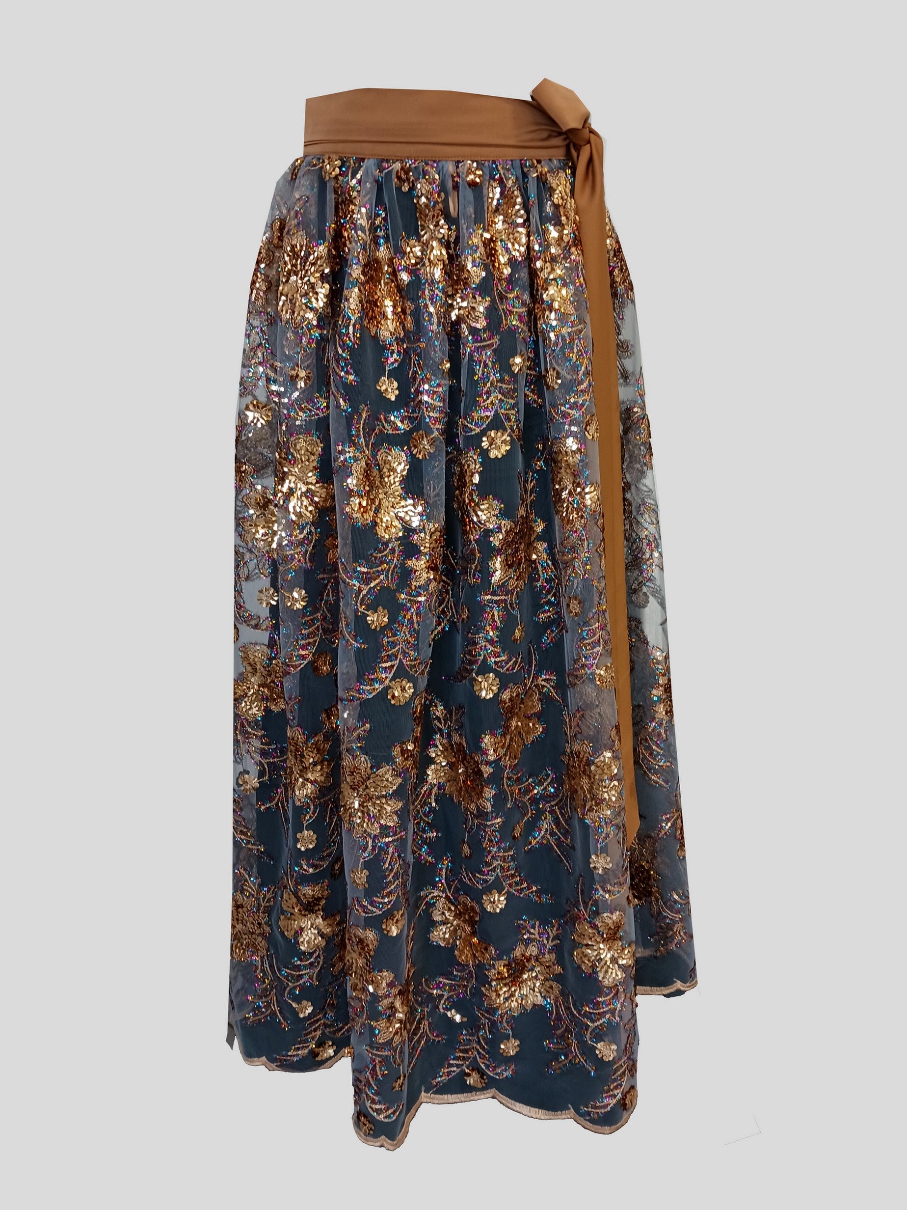 Edle Dirndlschürze Afrikanischer Tüll-Spitzenstoff mit Pailletten & goldenem Blumenmuster, einfach oder unterfüttert. Bund und Bindebänder sind aus farblich abgestimmten Stoff, einfarbig.